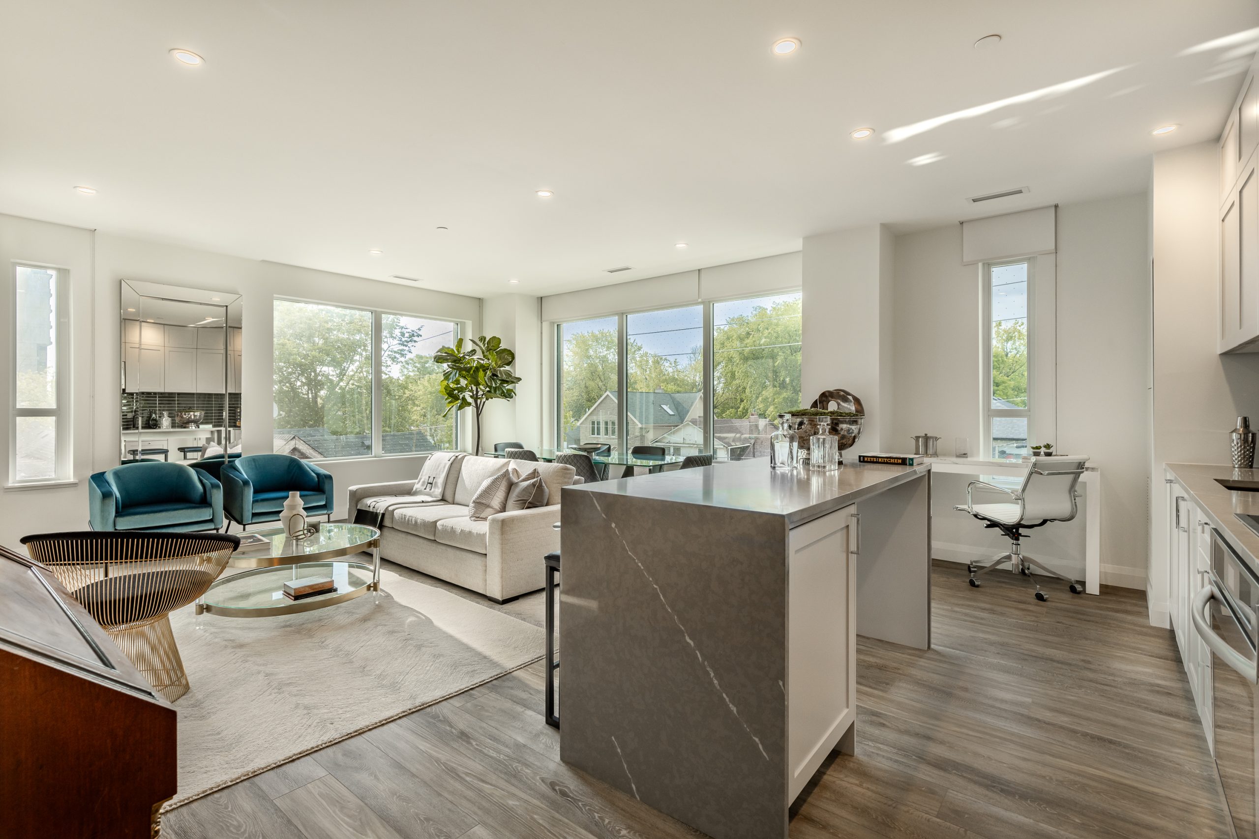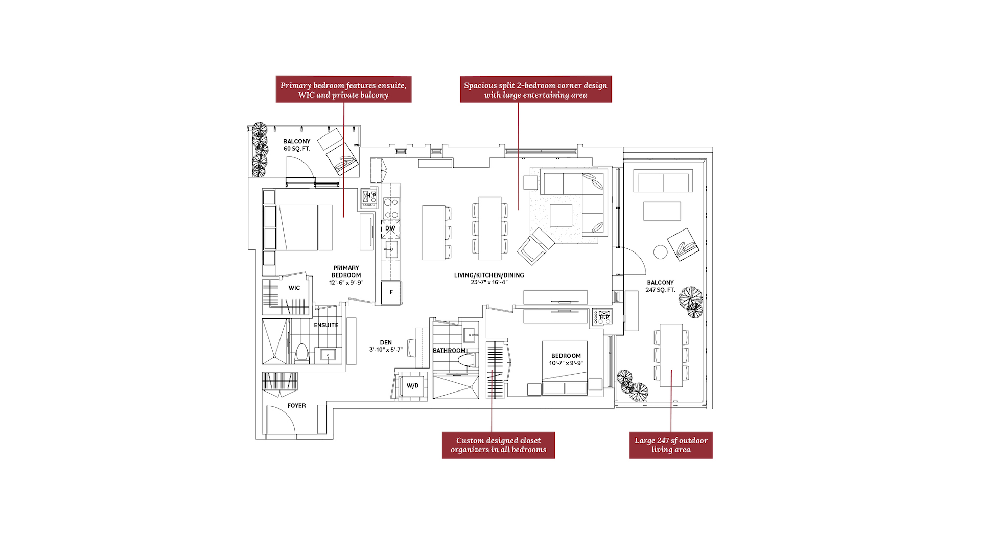 Rare in Midtown, the Mint offers a 2-bedroom plus den corner residence with 1,143 sq ft of sophisticated interior space and an impressive 247 sq ft terrace for true outdoor living. A split-bedroom design and generous entertaining areas provide seamless flow,